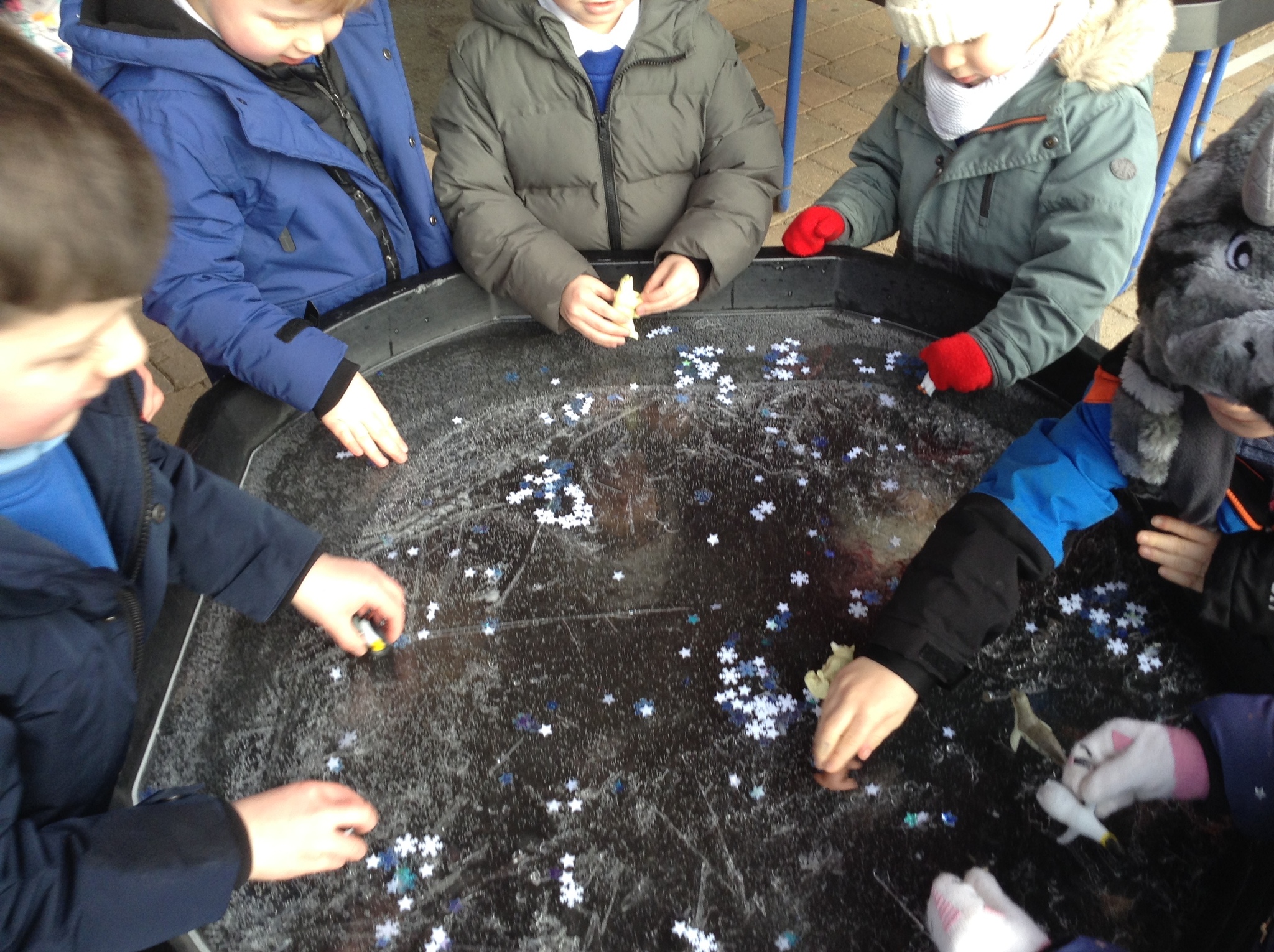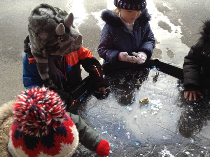 At the end of last week we took advantage of the cold, snowy and icy weather. We carried out an experiment to see what would happen if we left a tray of water outside overnight. The children were surprised the next morning when the water has disappeared and ice was in it's place! The children learnt about how water freezes into ice when it is very cold and they knew that their freezers at home work in the same way to preserve food. As the day went on the children were able to see the reverse process when the ice began to melt and turned back into water! Very fascinating!